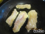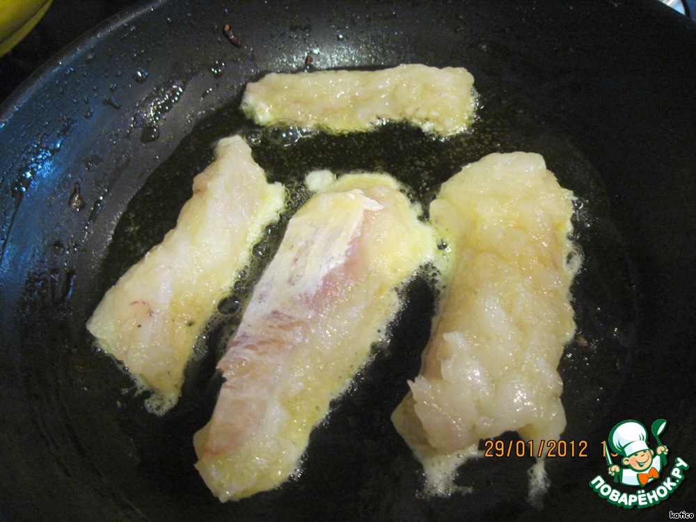 • Яйцо слегка взболтать с солью, кусочки рыбного филе обмакиваем в яйцо и слегка обжариваем на горячей сковороде в небольшом количестве растительного масла