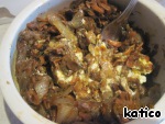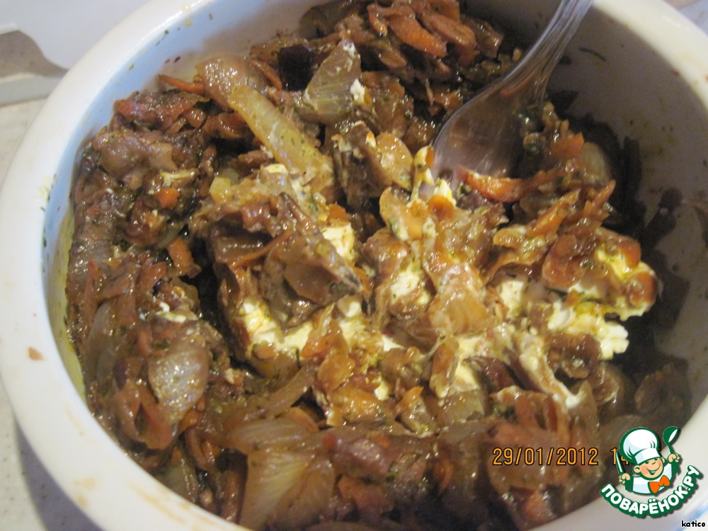 • В остывшие грибы с овощами добавляем сливочный сыр, можно сметану