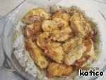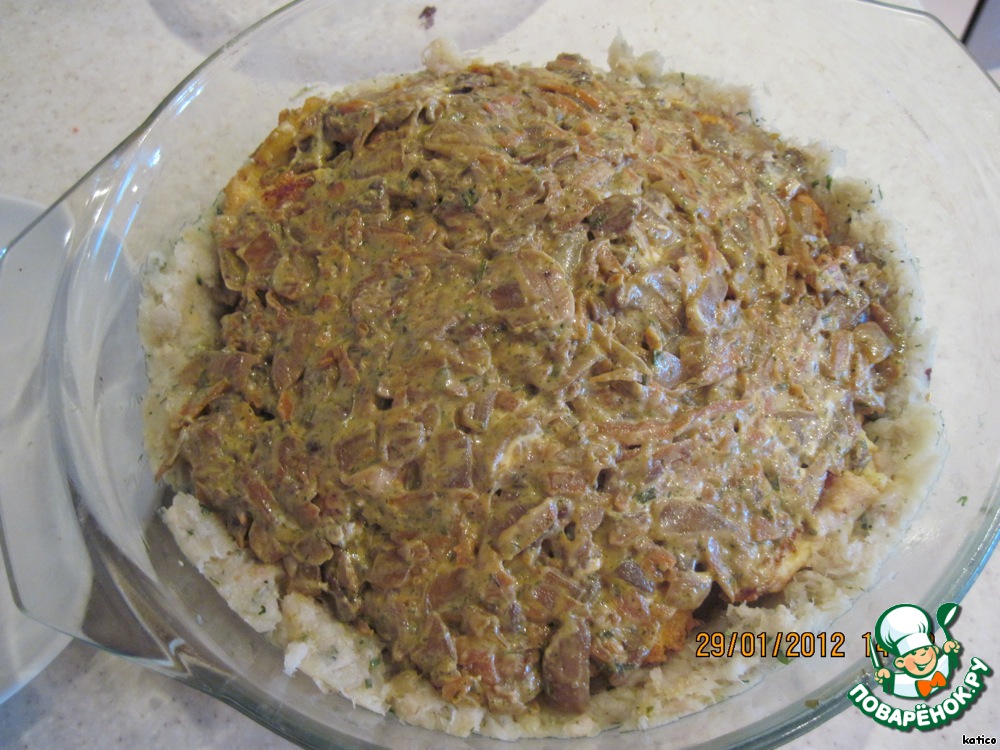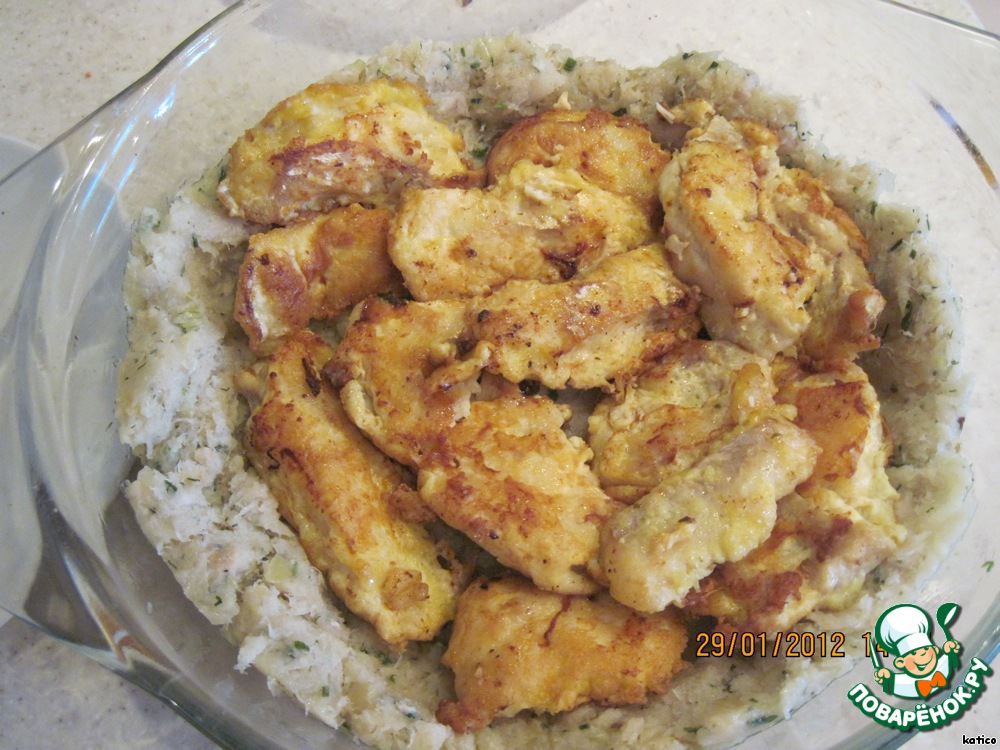 • Форму для запекания смазать маслом, выложить половину рыбного фарша, на него выложить обжаренные кусочки рыбного филе