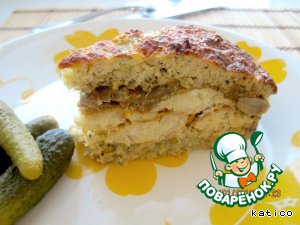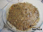 • На грибы выкладываем вторую половину рыбного фарша. Сверху поливаем взболтанным яйцом и отправляем в разогретую духовку - 170 град. на 40 мин.