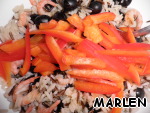 Перец нарезаем тонкой соломкой и добавляем к ингредиентам.