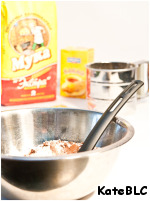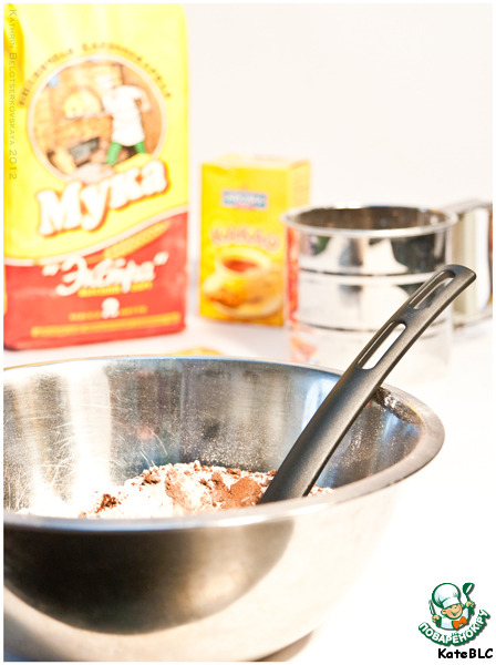 3. Просеиваем муку, разрыхлитель и какао в миску. Перемешиваем.