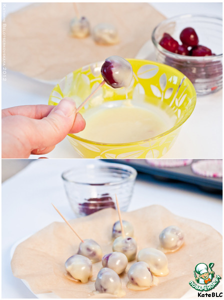 Погружаем ягоды в шоколадную смесь и выкладываем на бумагу для выпечки. Должны получиться вишенки в шоколадной оболочке. Убираем в холодильник или морозилку.
