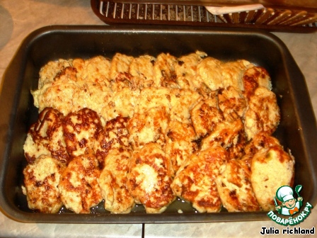 Обжаренные с двух сторон котлеты выкладываем на противень внахлест.