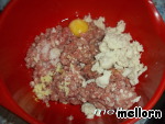 Фарш я приготовила сама из свиного и куриного мяса. Булку очистить от корок и замочить в воде до мягкости, отжать. Булку добавить в фарш. Затем яйцо, чеснок (через чеснокодавилку), перец, специи. Хорошо вымесить.