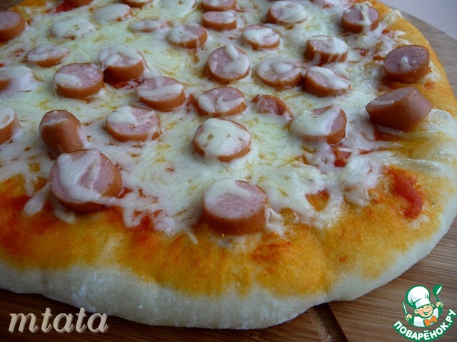 Тесто для пиццы готовится безопарным способом. Если Вы любите толстую пиццу (американский вариант), то тесто нужно делать из пропорции - 400 мл теплой воды на 600 г муки и после замеса поставить в теплое место на 1-2 часа. Но я люблю тонкую, итальянскую пиццу. Для этого тесто замешивается на холодной воде и готовится сразу. Дрожжи в этом случае дают просто кислинку в тесте. Итак, замешиваем тесто из воды, муки, оливкового масла, соли, сахара и дрожжей. Я делала в хлебопечи на режиме "Пресное тесто". Из указанного количества получается тесто на 4 пиццы, но я делала 2, поэтому половину бросила в морозилку, оно там прекрасно хранится.