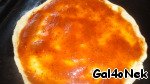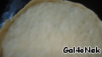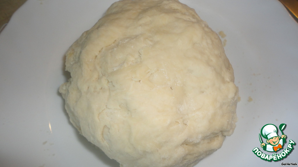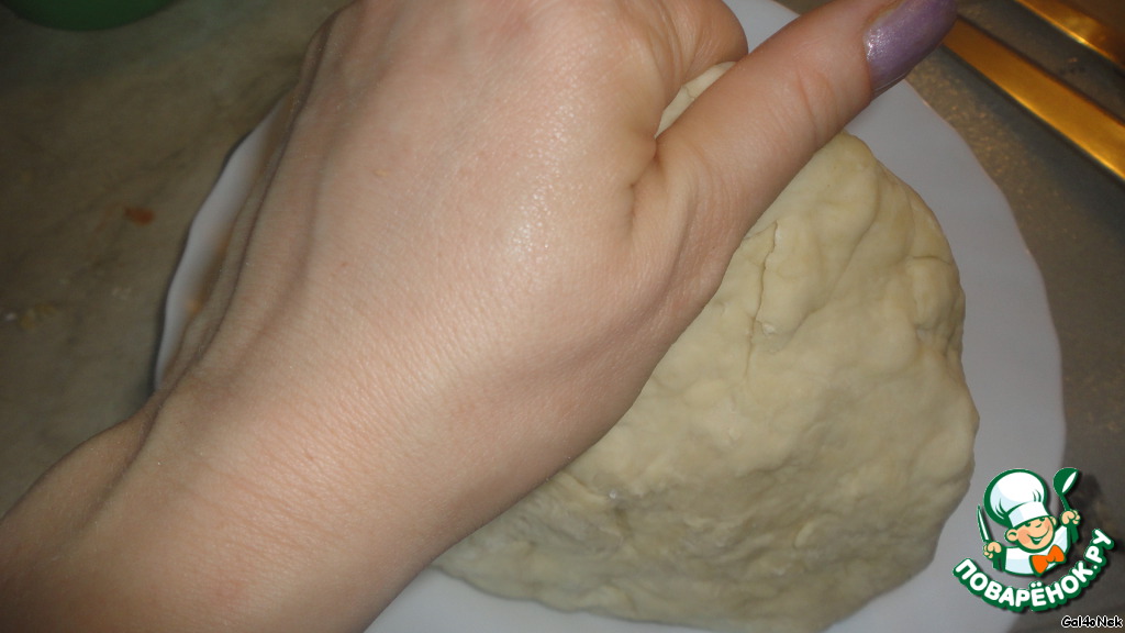 Ну, закончу уже про тесто. Получается оно достаточно плотным и скалкой его не раскатаешь. Зато корж из него выходит твердым и хрустящим. Такое тесто нужно разминать и растягивать руками. К сожалению, сфоткать не удалось, т. к. одна рука была занята фотоаппаратом.