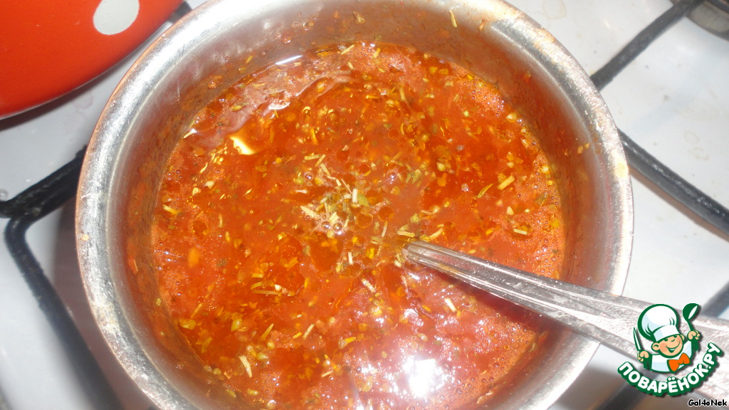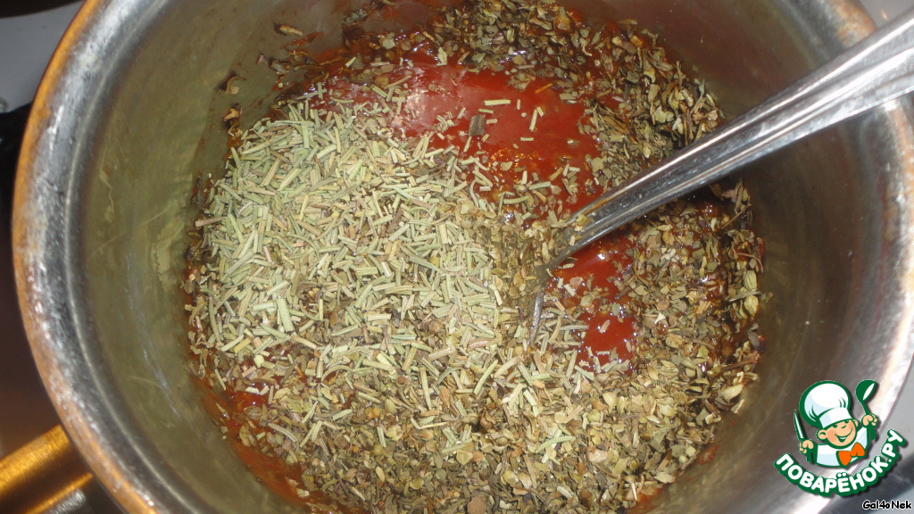 Томатную пасту я разбавила до состояния густого томатного сока. Количество воды (200 мл) я написала примерно, так что лейте "на глаз". Добавляем травы, соль, сахар, оливковое (или другое растительное) масло, ставим на огонь.