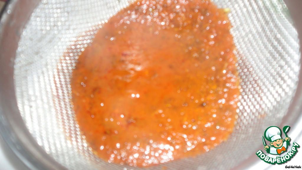 Пряные травы (орегано, базилик, тимьян, розмарин) уже сделали свое дело и отдали ароматы соусу. Теперь они нам не нужны, а соус должен быть однородным. Поэтому процеживаем его через сито.