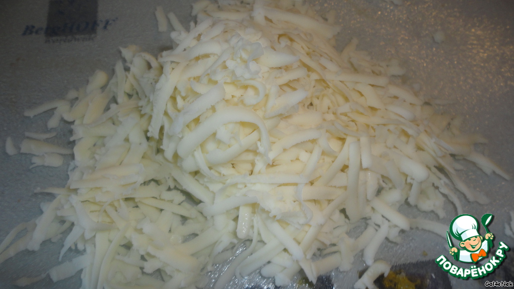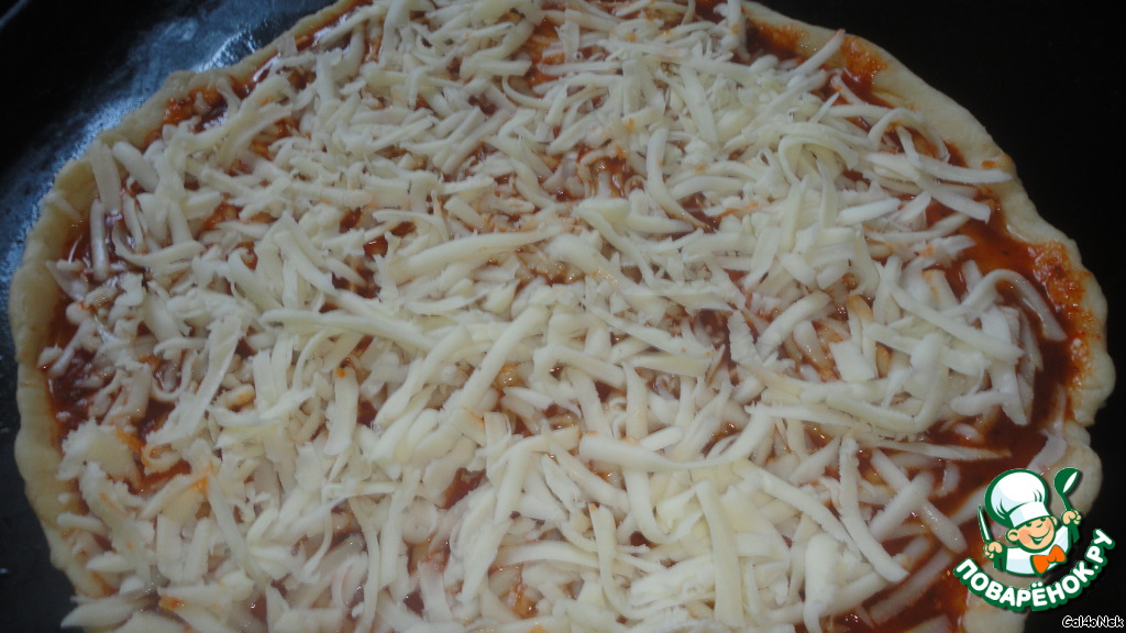 Засыпаем сыром. Кстати, если моцареллы у Вас все-таки не нашлось, то нужно сначала положить начинку, а потом засыпать сыром.
