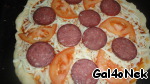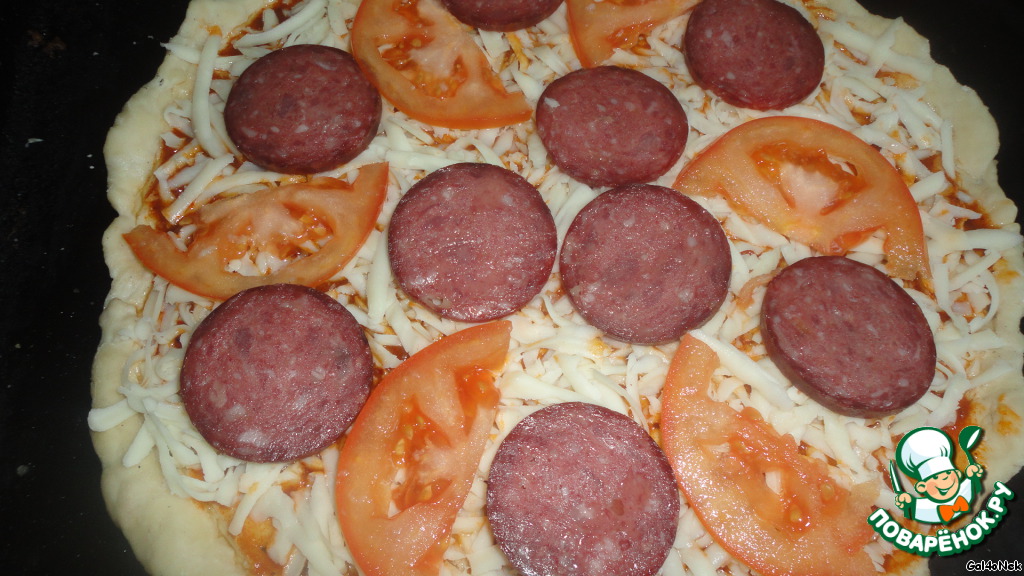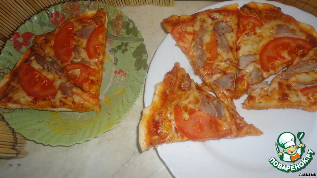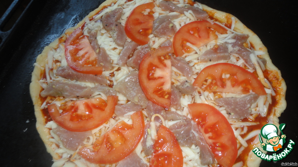 А теперь пусть гуляет Ваша фантазия. Начинка может быть самая разнообразная. Ну это Вы и без меня знаете. У меня одна пицца была с маринованной в киви и имбире свининой и с помидорами. И еще момент, свежие помидоры я немного подсолила.