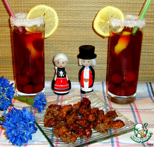 Края бокалов обмакнуть в воду, затем в сахар. Аккуратно положить в каждый бокал вишни из компота.