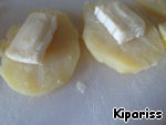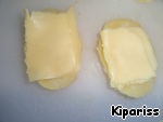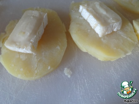 • Картофель нарезать ломтиками толщиной 0,5 - 1 см (в зависимости от размера клубней), выложить на первый ломтик сыр, накрыть вторым ломтиком.