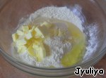 В муку добавить белок, сливочное масло (нарезать кубиками), 1 ст. ложку воды. Замесить тесто руками, завернуть в фольгу и отправить в холодильник на 30 минут.