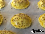 Тесто раскатать, вырезать кружочки. На половину кружков разложить порции начинки. Накрыть остальными кружками. Слепить края. Пирожки уложить на противень, смазать желтком, посыпать тмином. Отправить в горячую духовку. Запекать до золотистого цвета.