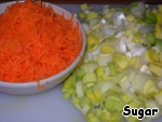 • Морковь очистить и натереть на мелкой терке, лук-порей нарезать тонкими полукольцами.