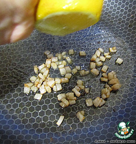 Припускаем сало, чтобы оно выделило сок (поджаривать до шкварок не надо). Выключить огонь и выдавить лимонный сок.