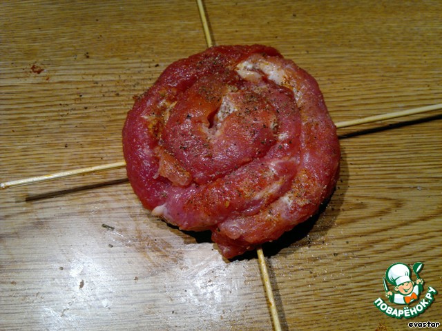 Скрепить "улитку" шпажками. Я потом концы обломила, чтобы жарить было удобнее. Можно оставить мариноваться на полчасика.