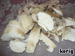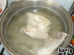 Готовим бульон. Моем половину курицы, очищаем от кожи. Варим до готовности.