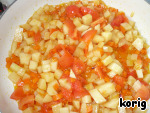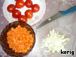 Подготавливаем овощи. Все режем кубиком - лук, морковь, картофель. Помидоры режем на 4 части.