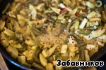 • Откройте и добавьте оставшиеся компоненты. Усильте огонь и варите, пока не выпарится вода, и стручки не начнут шипеть в приправленном масле.