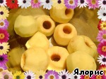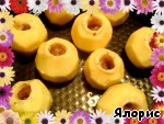 В смазанную разъемную форму кладем яблоки. Чайной ложкой выкладываем в каждое яблоко немного теста – чтобы закрыть дно. В образовавшиеся чашечки из яблок кладем темный шоколад, поломанный на маленькие кусочки.