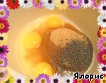 Коричневый сахар, яйца, мак нужно взбить миксером.