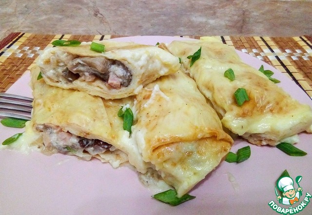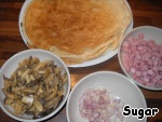 Выпекаем блины. Каждая хозяйка может сделать это по-своему. Я, например, делаю блины из молока, пива, яиц и муки. Ветчину нарезаем кубиками, лук - мелко, шампиньоны - пластинками.