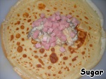 Сверху посыпаем ветчиной и заворачиваем в конвертик.