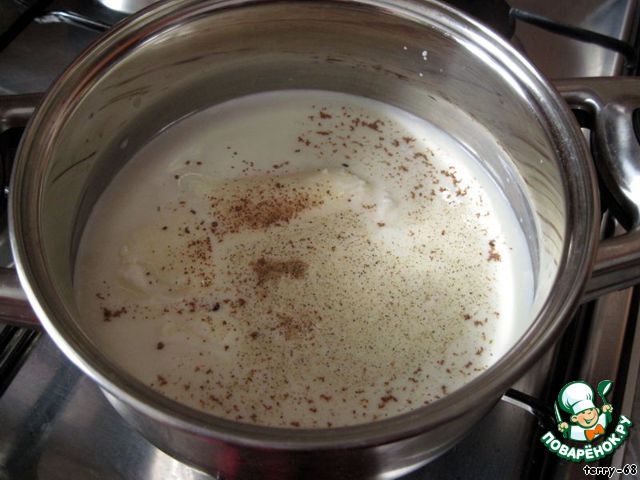 В кастрюльку с толстым дном налить молоко, добавить 0,5 ч. л. соли, щепотку мускатного ореха и черного молотого перца.