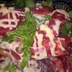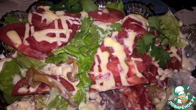 Первоисточник рецепта - одна из пиццерий нашего города. Салат яркий, сочный и вкусный, понравится и мужчинам, и женщинам. Хорош и на каждый день, и к праздничному столу будет вполне уместен.