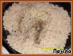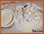 Слова автора. Перемешать муку, картофельные хлопья и разрыхлитель. Положить нарезанное масло.