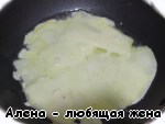 По истечении часа сковороду накалить, смазать растительным маслом. Яблочные пластинки окунать в тесто и выкладывать на сковороду внахлест, чтобы получился блин.