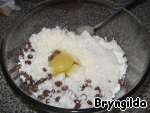 Творог растереть с сахаром, добавить изюм и яйцо и перемешать.