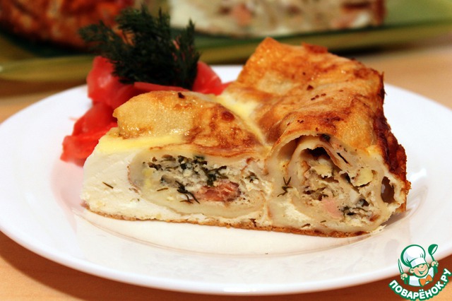Пересматривая рецепты блинных пирогов, думала испечь сладкий, но, найдя в холодильнике упаковку с/с форели, вспомнила, как отлично сочетаются творог, рыба, зелень и чесночный аромат. Родился довольно простой заливной пирог, который отлично подойдет на любой праздничный стол, к ужину, как закуска, отличный вариант перекуса в холодном виде, а в горячем незаменим к сладкому чаю!