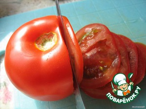 Тем временем режем помидор. Нужен острый нож, так как резать его надо очень тонко, 1-2 мм. где-то.