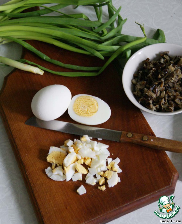 Смешать отваренный дикий рис, измельченные лук и яйцо. Круто посолить и поперчить. Добавить 50 г растопленного сливочного масла. Перемешать. Начинка готова.