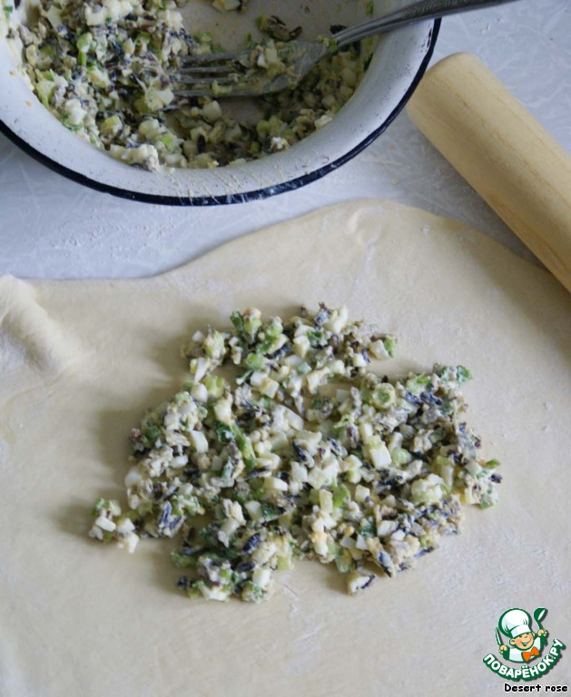 Раскатать тесто в пласт толщиной 3 мм. Равномерно нанести начинку, отступив от краев на 3 см.