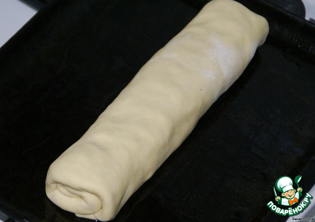 Завернуть тесто с краев и свернуть в рулет. Положить его на смазанный растительным маслом противень и отправить в разогретую духовку. Выпекать при температуре 180-200 градусов 30 минут.
