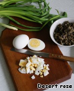 Отварить яйцо. Нарезать его кубиками, нарезать зеленый лук.