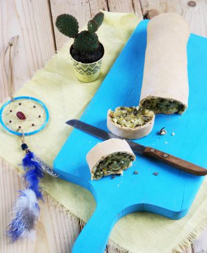 Рулет из кукурузной муки с начинкой из дикого риса, яйца и зеленого лука. Блюдо на индейский манер…