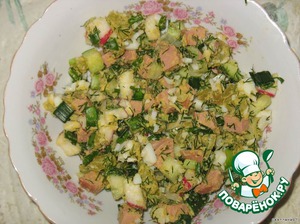 Все перемешиваем, солим. Раскладываем по тарелкам. Добавляем ложку сметанки. Отдельно в предварительно охлажденной в холодильнике воде разводим уксус, лучше фруктовый - яблочный или виноградный. Это на вкус, я довольно кисло делаю.