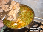 • Суп закипел! Время отправлять туда креветки и горошек.