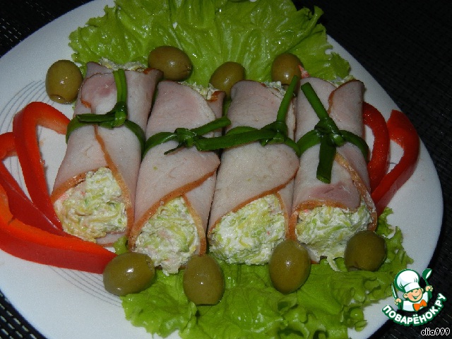 Ветчину (карбонад) нарезать тонкими ломтиками и на каждый выложить начинку. Свернуть трубочкой и убрать в холод на 10 минут. Перед подачей украсить зеленью.