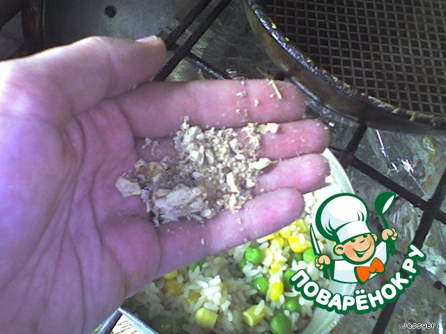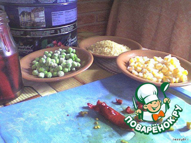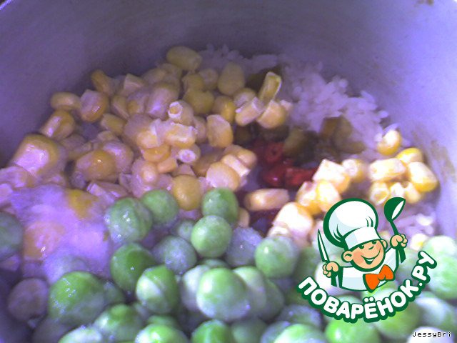 Перец нарезаем меленько, с горошка и кукурузы сливаем жидкость (или достаем из пакета - у меня были замороженные). Рис промываем и ставим варить.