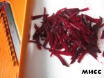 Предварительно отваренную свёклу нарезаем кубиками или тонкими полосками. Я опять использовала для этого тёрку.