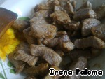 • На хорошо разогретую сковороду с маслом отправляем мясо и обжариваем до румяной корочки, примерно 5 минут. Выкладываем мясо в миску.