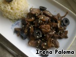 • При подаче украшаем колечками маслин (они прекрасно дополняют это блюдо), можно посыпать кунжутом. Готово! Мясо получается сочным и очень вкусным, словно оно мариновалось, грибочки также приобретают новый вкус благодаря вину! Попробуйте и вы точно останетесь довольны!