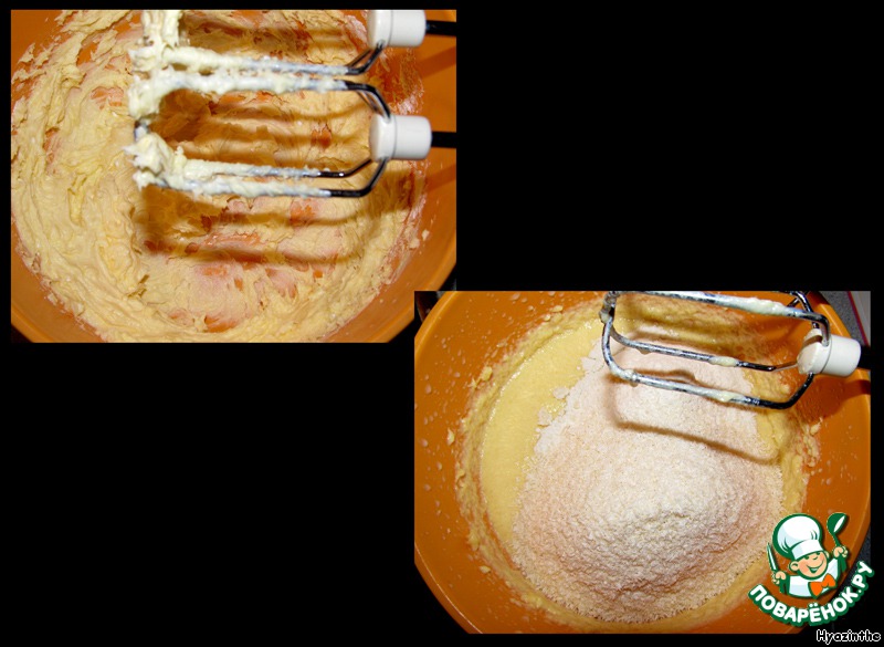 Продолжая взбивать, добавляем муку, кокосовую стружку, ванильный сахар и разрыхлитель.