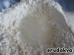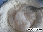Дрожжи смешать с 1/2ч. л. сахара, залить 50мл теплой воды, перемешать и поставить в теплое место. 1ст. муки просеять в миску. Добавить щепотку соли.
